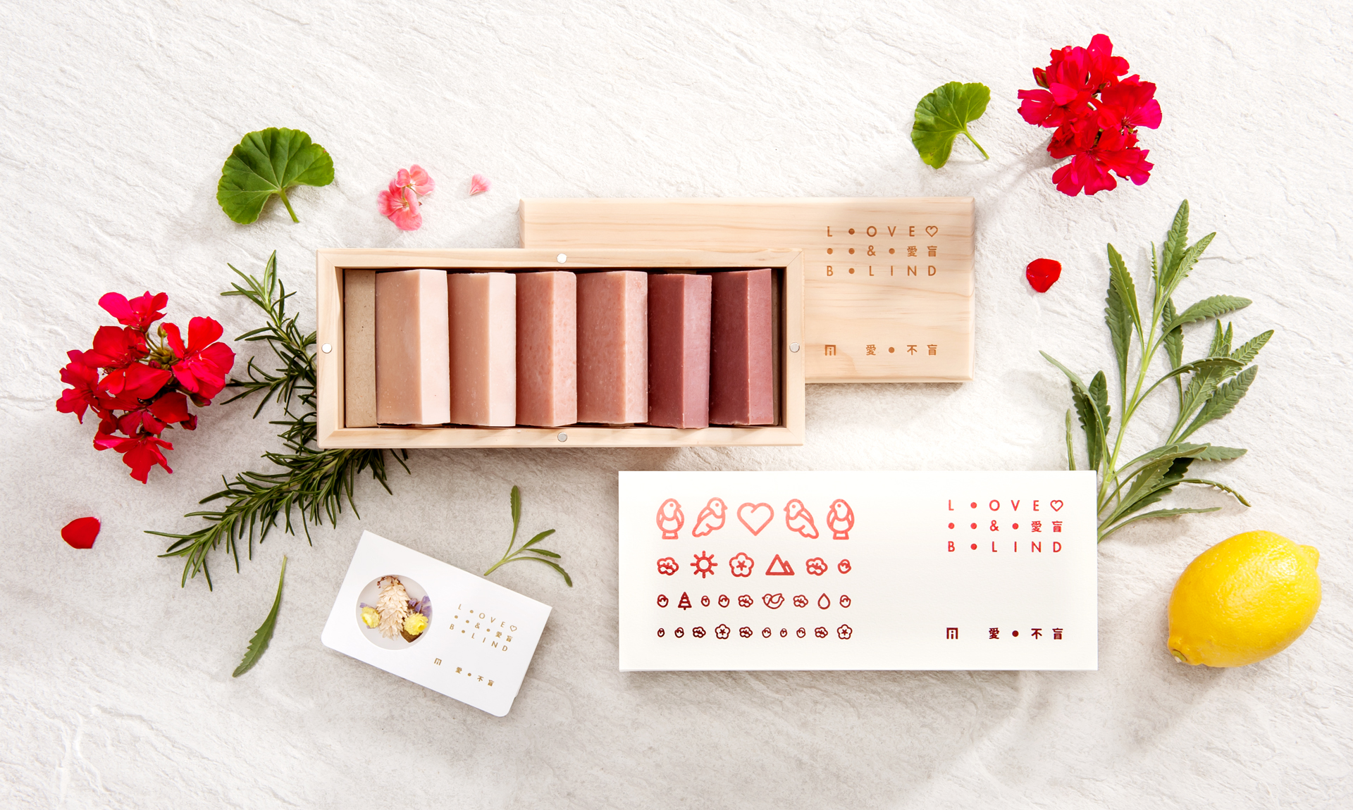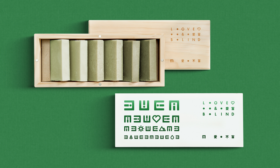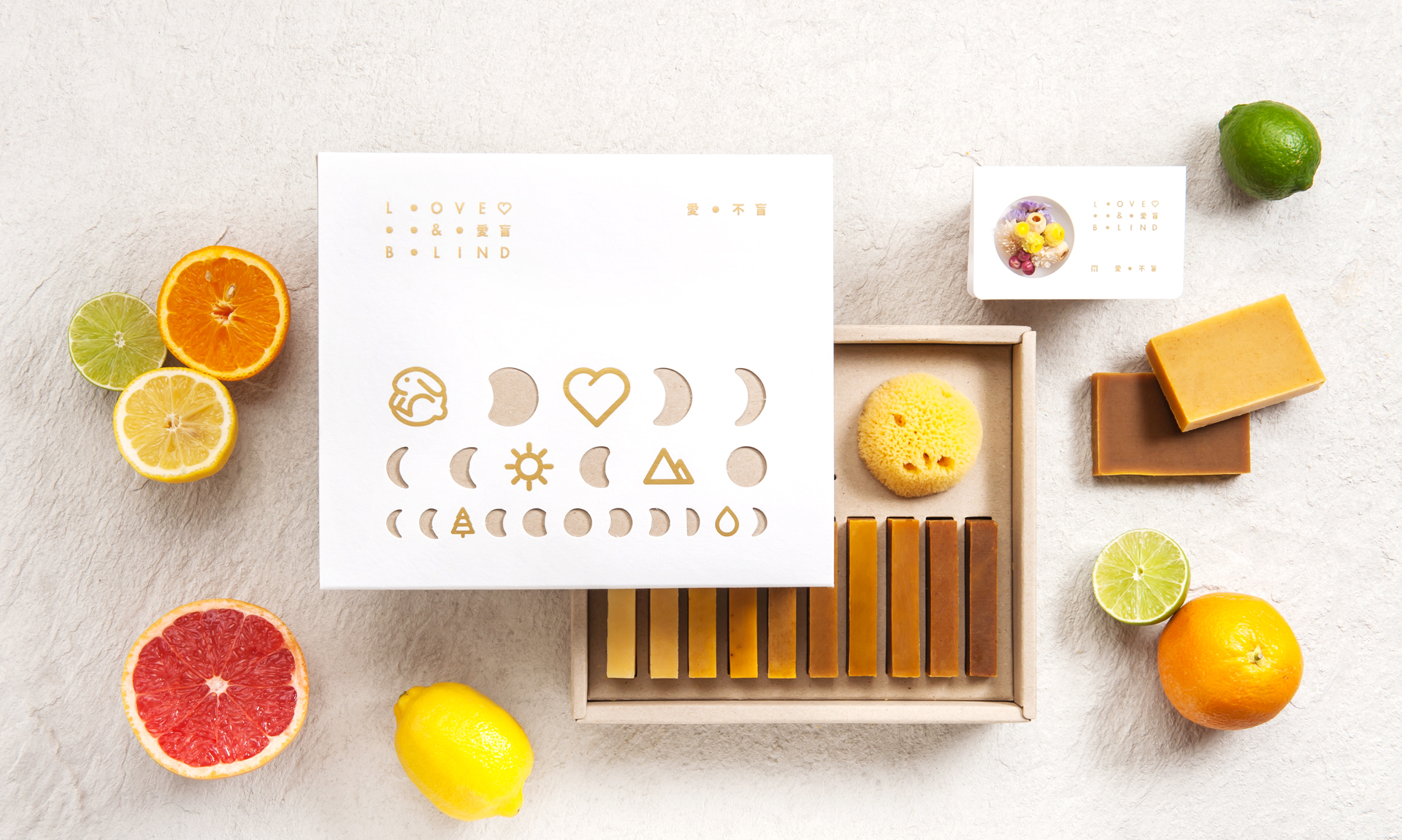 SPARKLY evaluates the business system of the foundation and sheltered workshop, and then defines the latter as the sales department. The first phase is based on the hand-made soaps, integrating the brand logo “Love is not blind” for its identification. SPARKLY utilizes the Braille of “Love” as the main characteristic, where the different opens of each character on the eye chart represent the diverse directions of our life. The Mandarin Phonetic Symbol “ㄇ” symbolizes the sheltered workshop, and the English alphabet “i” represents the visually impaired people within, cleverly combining with the element of an eye chart to demonstrate the idea of doing charity with love through the clear eyes; this is “Love is not blind.”